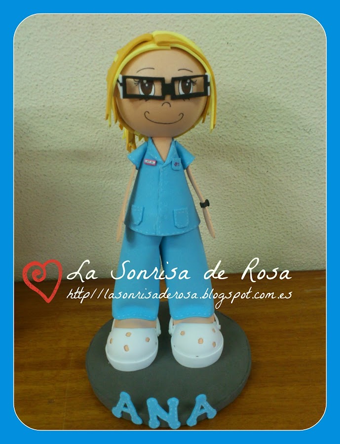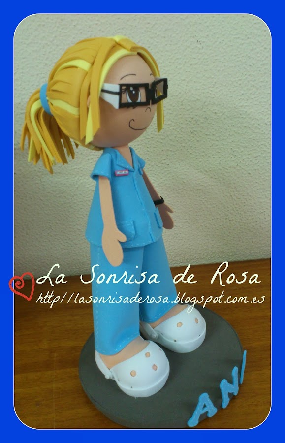 He intentado que se pareciera a ella lo maximo posible, con sus gafitas de pasta, su pendiente azul en el lobulo de la oreja,que en las fotos no se ve!! :( y su reloj. y por supuesto lleva el uniforme del hospital donde trabajamos ambas.