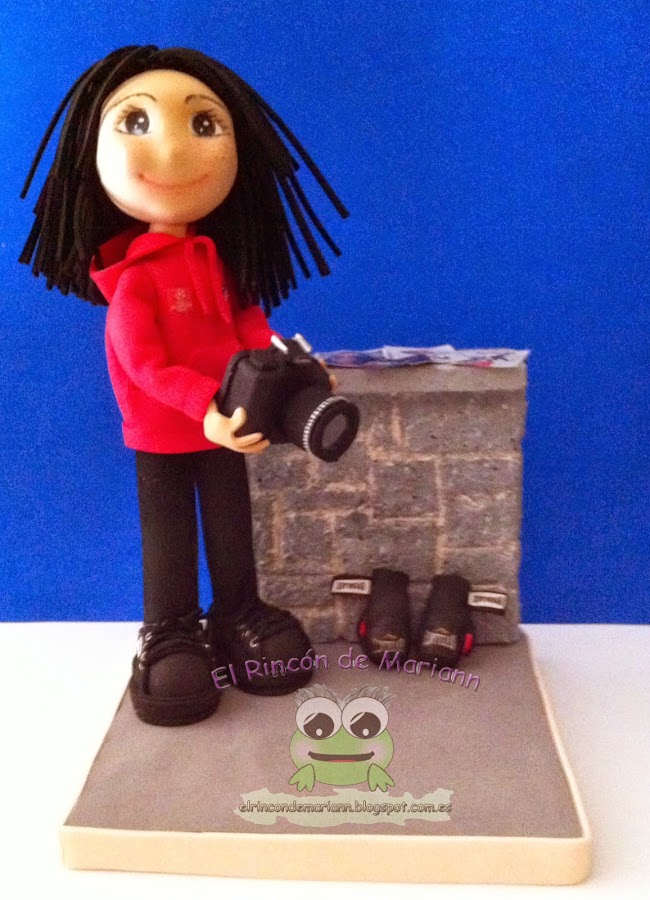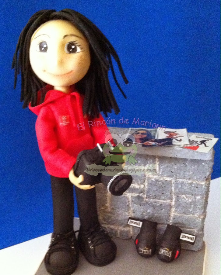 Es una muñeca para alguien a la que le encanta la fotografía y como deporte practica el kickboxing, asi que, aquí está, con su cámara Canon y sus guantes de boxeo. Su sudadera de la champion league del Atletico de Madrid y sus zapatillas de doble suela Victoria. Como veis totalmente personalizada y a la que tampoco le falta detalle.