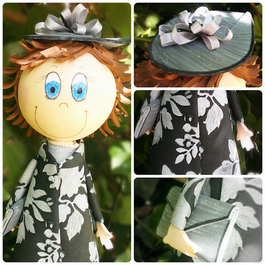 En este caso utilicé un texturizador de la máquina Big Shot Sizzix para dar dibujo al abrigo, y le dí color con rotulador permanente plateado. Queda un precioso conjunto con los zapatos y el bolso a juego. Para culminar el modelito, esta preciosa madrina se puso un tocado de lazos plateados y plumas negras. Conchi se sintió tan identificada al ver su muñeca, que se la saltaban las lágrimas.