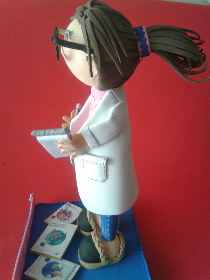 Esta es la última maestra que he hecho, es una guardería, la bata esta hecha con tela para que fuera igual que la original. Tiene un montón de detallitos y he intentado plasmar los detalle más importantes de la clase de los pingüinos.