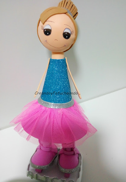 Pregunté y me dijeron que Alicia suele vestirse de rosa y a veces también de turquesa,que le gusta el plateado y por supuesto mucha purpurina,asi que parte de arriba en turquesa, y faldita y patines en rosa.