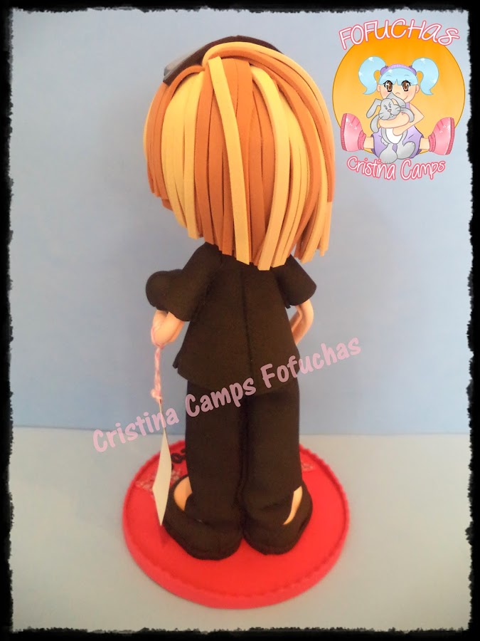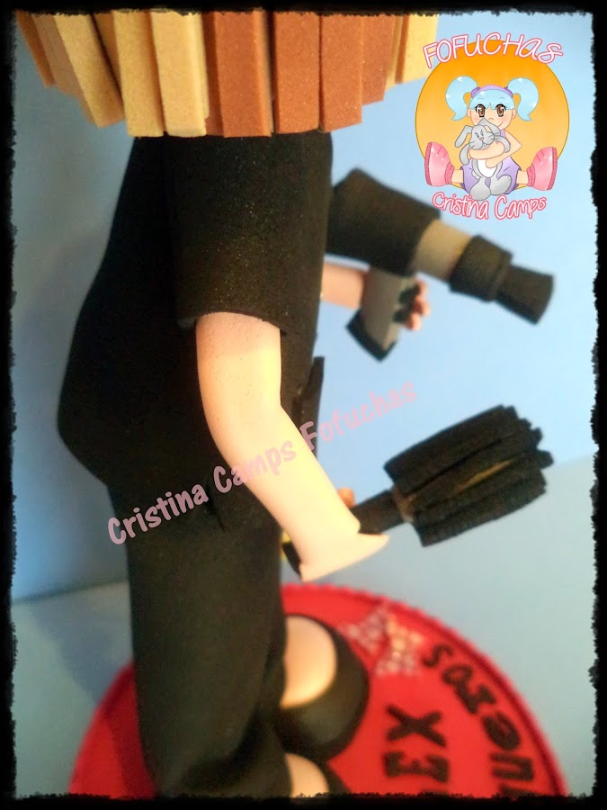 Esta vez os traigo a una fofucha peluquera, se llama Leo y sus familiares han querido tener un detalle con ella por su 50 cumpleaños. La fofucha lleva una camisa de color negro con bordados en dorado y una cremallera en la parte delantera. En su mano izquierda lleva una plancha de pelo y está apoyada sobre un carrito con utensilios de su profesión (toallas, tinte, bote de espuma, rulos, tijeras ...