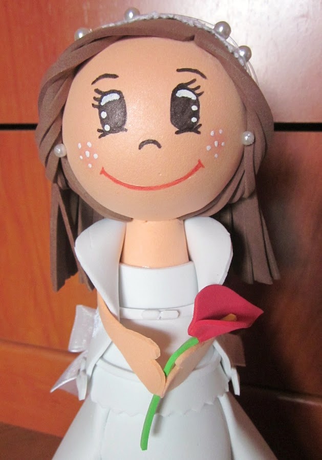 Estas son algunas fotos de la fofucha Silvia vestida de comunión. Hicimos 35 como regalo para cada pareja de invitados. Son de nuestras primeras fofuchas. En las fotos no se aprecia, pero lleva el cuerpo del vestido grabado a relieve. Hemos visto fofuchas de comunión que llevan los vestidos hechos de tela. Nosotros decidimos hacerlo todo de goma eva, incluidos los adornos, pensamos que se vería má ...