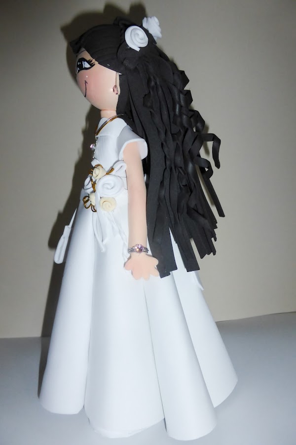 Una muñequita de comunión para la princesa de Amalia,, la parte superior del vestido la he pintado y las flores de la base están realizadas con un troquel de la big shot pero se pueden hacer perfectamente recortándolas a mano. Espero os guste, mil graciasY por supuesto gracias Amalia por tu amabilidad.