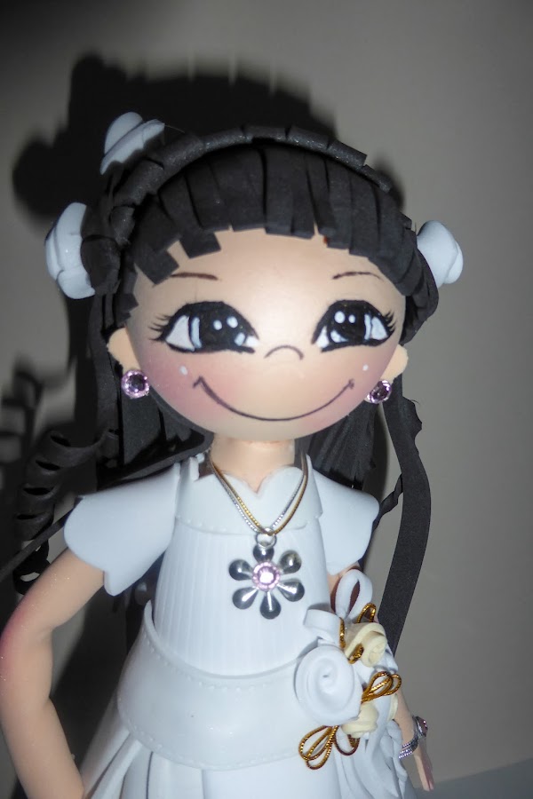 Seguimos con las Fofuchas de Comunión Ya que ahora es la epoca Estoy llenita de encargos de estos, poco a poco ire subiendolos. :) Esta en realidad no es para una niña, sino para una señora, que no pudo vestirse como una niña de comunión y tenia esa pena... Así que su hermana decidio regalarle una Fofucha vestida de comunión :) Graciosa Historia ? Muakc?