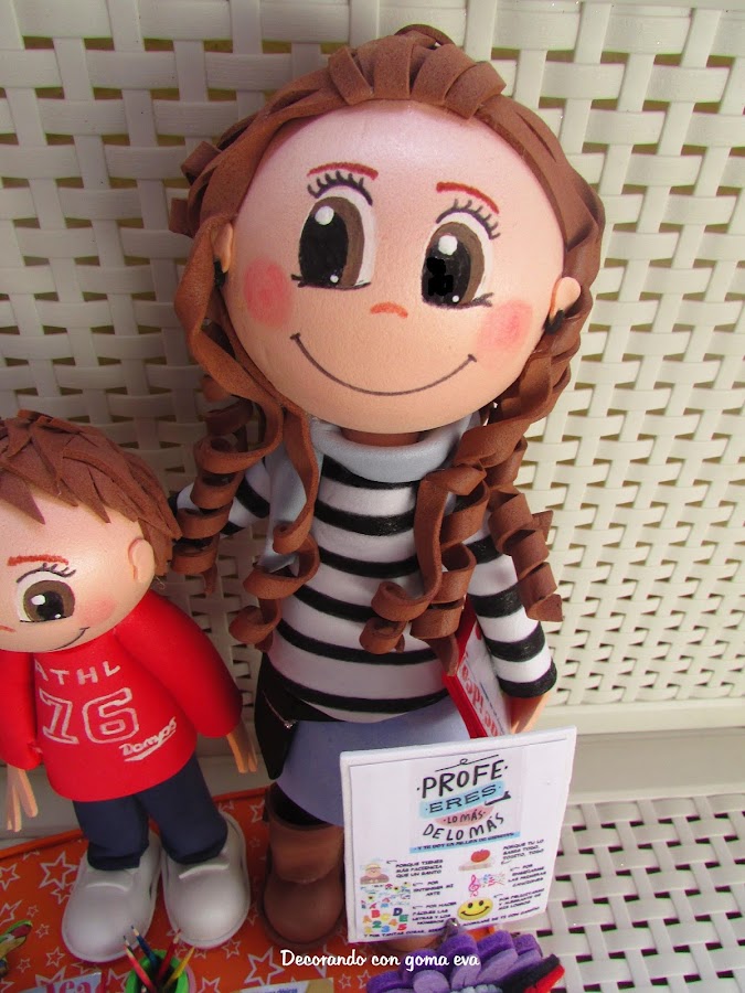 Por fin os la puedo enseñar!!. Es la fofucha que le he hecho a la profesora de mi hijo, que hoy se graduaba, no le falta detalle, con sus dedicatorias, con algunas de las carpetas de estos tres cursos de infantil, las mascotas del curso Mimos y Jaja, algunos cuentos y el bote de pinturas. Nos ha hecho mucha ilusión poderle dar este regalo con todo el cariño y porque se lo merece.