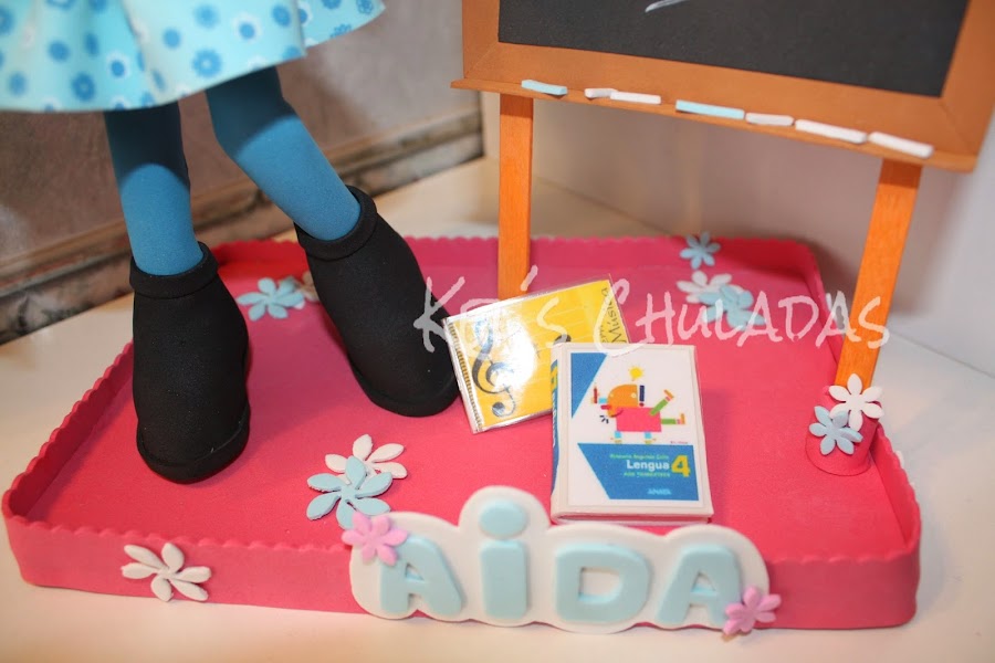 Buenos días!!. Siguiendo con los regalos para las profesoras, ya que pronto se acerca el fin de curso, os enseño esta fofucha para una profesora de infantil. En la pizarra la dedicatoria de todos sus alumnos, vestida con el baby que suele llevar y con la carpeta con los libros y fichas que utilizan en clase.