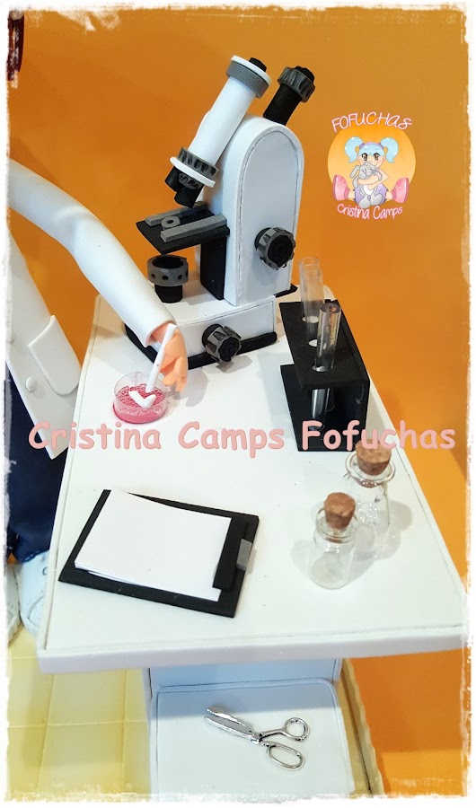 Os dejo esta fofucha doctora, en su laboratorio. Le he puesto una mesa de trabajo y algunas de sus herramientas habituales.