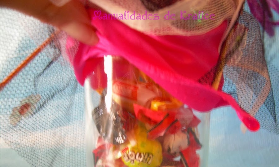 El tarrito de cristal lo he rellenado con chuches y caramelos