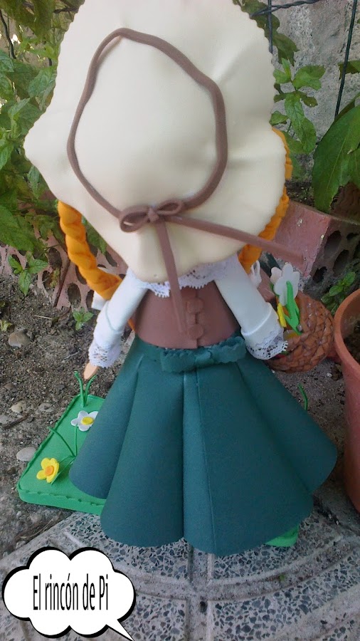 Preciosa fofucha de época con todos sus detalles. Sombrero con tul y flor de raso. Vestido con encaje, sombrilla...
