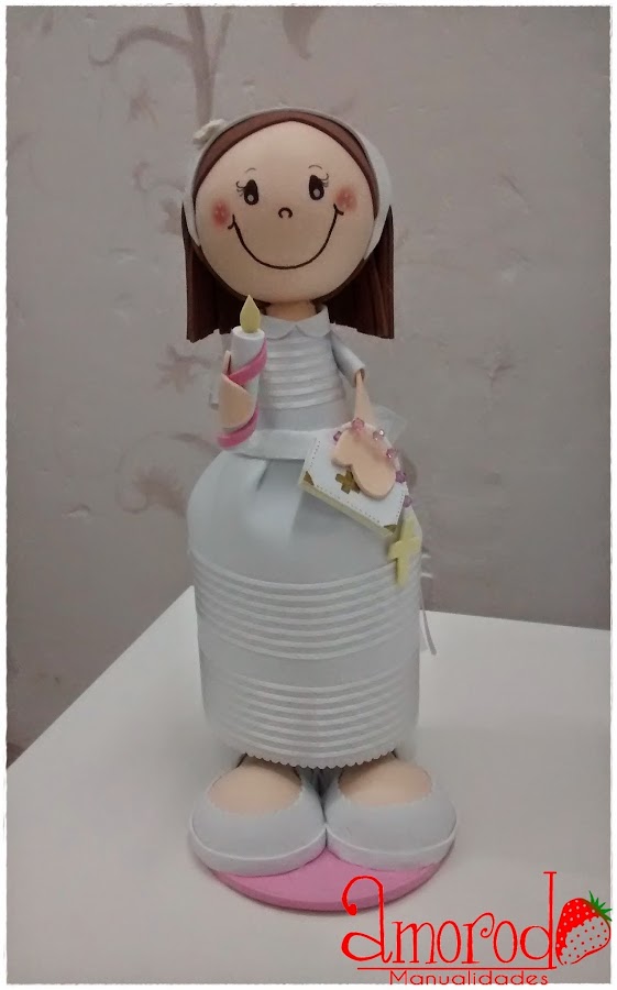 Estas son algunas fotos de la fofucha Silvia vestida de comunión. Hicimos 35 como regalo para cada pareja de invitados. Son de nuestras primeras fofuchas. En las fotos no se aprecia, pero lleva el cuerpo del vestido grabado a relieve. Hemos visto fofuchas de comunión que llevan los vestidos hechos de tela. Nosotros decidimos hacerlo todo de goma eva, incluidos los adornos, pensamos que se vería má ...