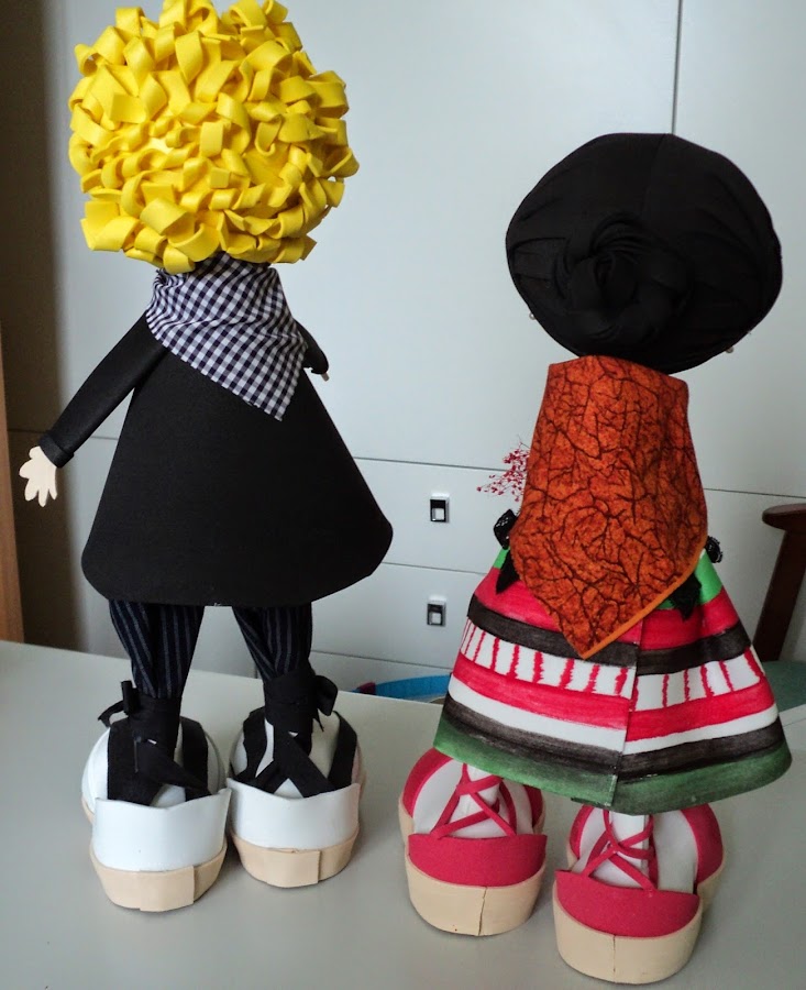 Son mas grandes de lo que habitualmente hago las fofuchas porque quería que se vieran bien dentro del escaparate. El muñeco tiene una altura de 38 centímetros y la muñeca 36 centímetros.