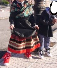Además de la goma eva utilice tela para hacer el pantalón, el pañuelo del chico y el manto de ella, que esta sujeto con un broche. Para la falda lo que hice fue pintar la goma eva con los colores que lleva la falda típica. Añadí puntilla para hacer el borde del delantal y unas lentejuelas para adornar la parte interior.