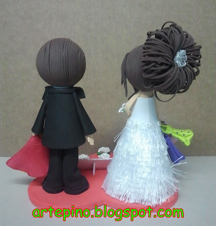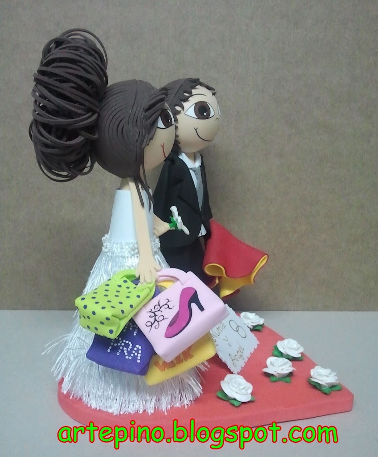 Hace un par de meses una amiga me pidió que si podía echarle una mano a hacer unos novios para su hermano que se casaba, así que la dije que se viniera a mi lugar de trabajo y la iría indicando para que ella misma los hiciera, y así le quedaron, bien bonitos.Más fotos en FOFUCHAS arte pino