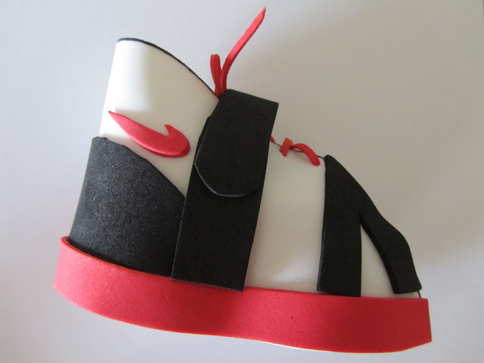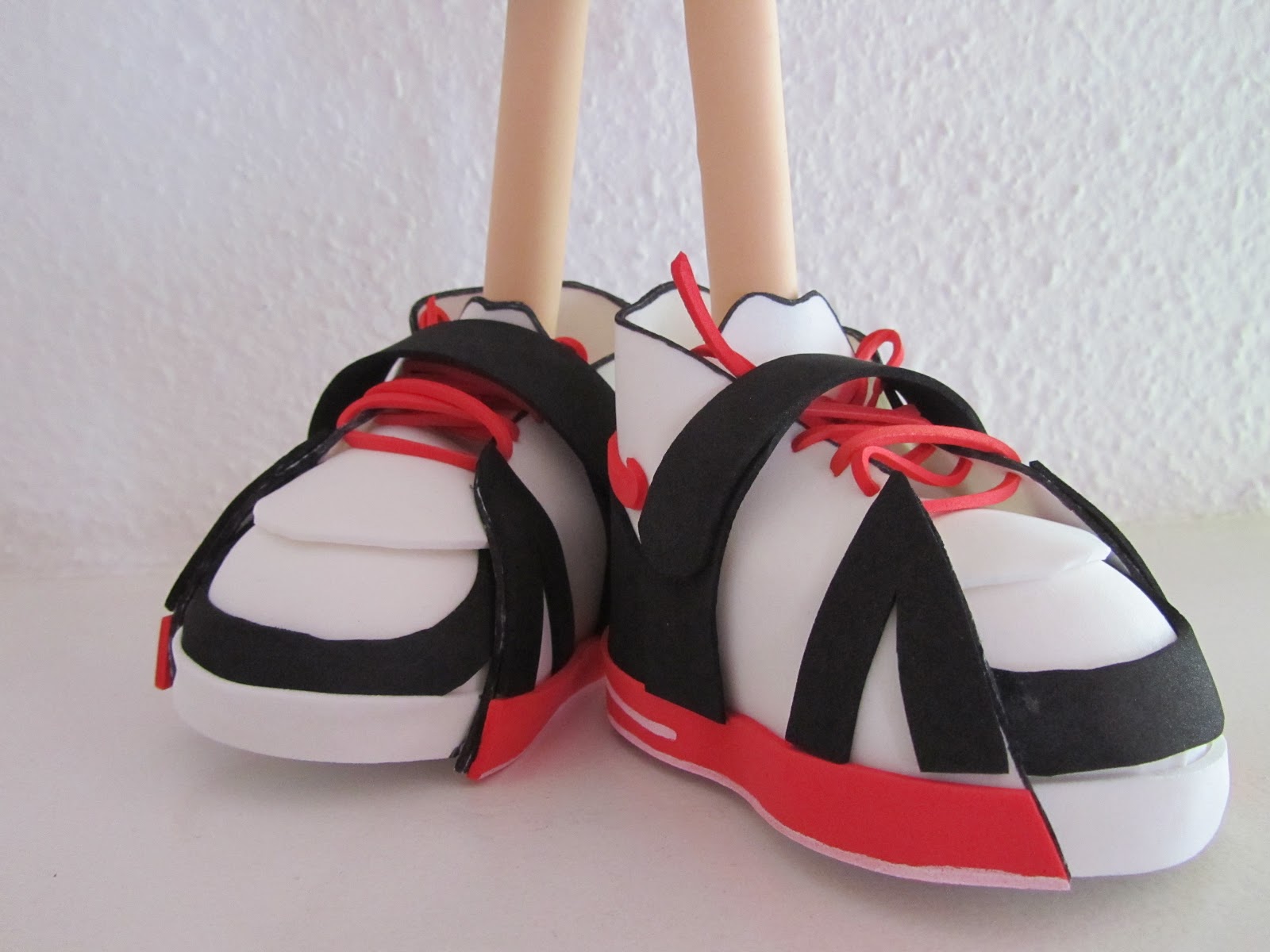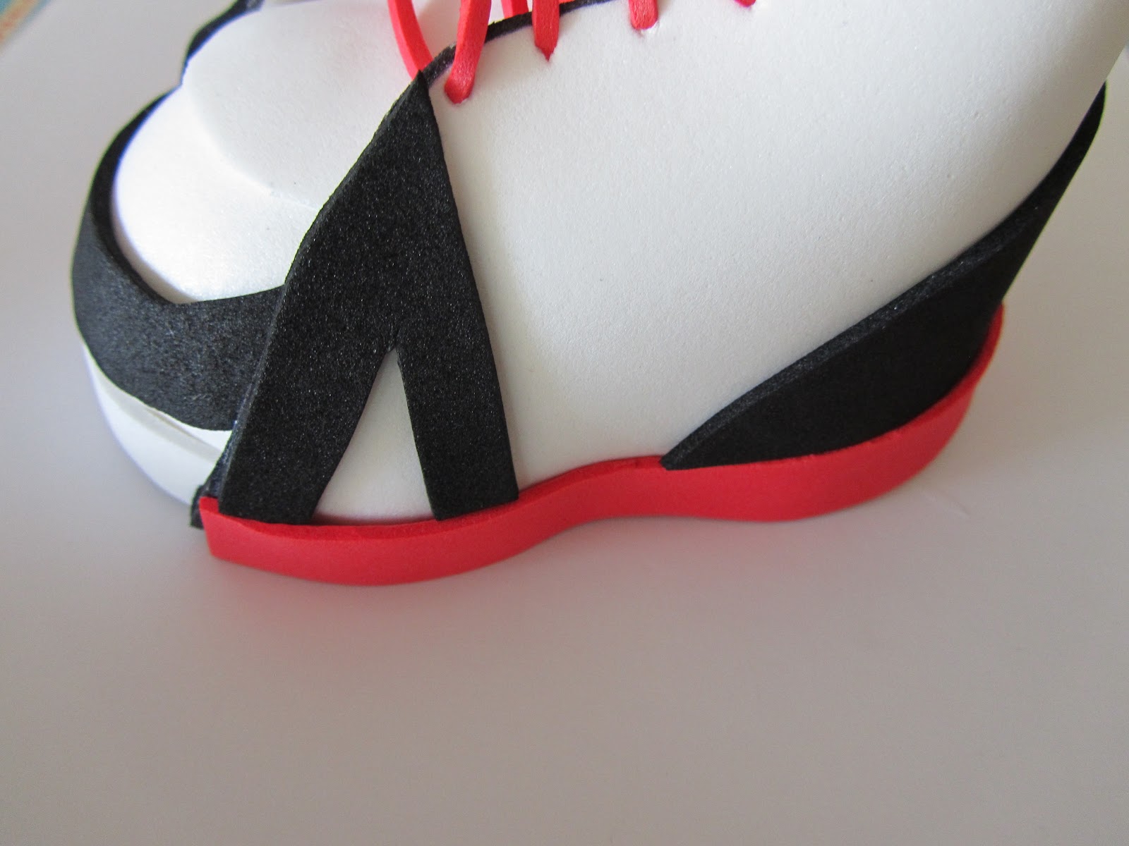 Luego recortad una tira muy fina de foami del color que vaya a ser el cordón (en este caso es rojo), y enhebrarla en una aguja para coser lana, de esta manera podréis pasarlo por los agujeros sin dificultad. Recortad una tira roja para que haga de suela de la zapatilla y engancharla alrededor de la bota (ocupando el espacio que antes hemos dejado cuando hemos pegado los detalles en negro)