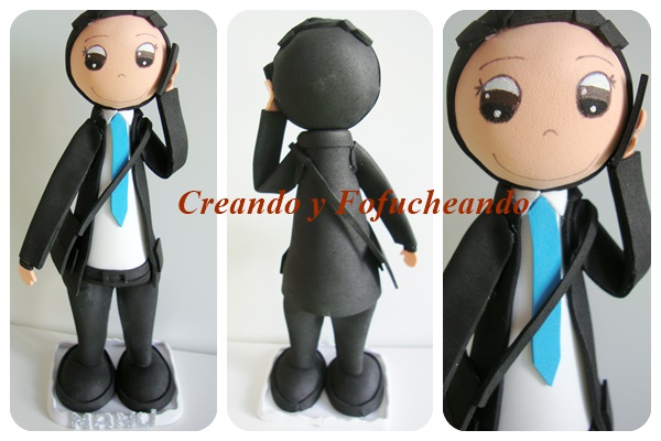 Este Fofucho es muy sencillo: traje y zapatos negros,camisa blanca y corbata azul de la empresa,y está personalizado con los accesorios propios de su dueño: el móvil siempre pegado a la oreja,su bolso negro también,y una pulserita de cuero en una de sus manos.