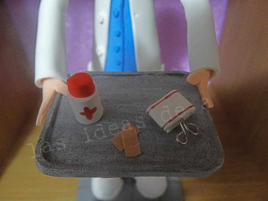 Tiene muchísimos detalles como las gafas, los zuecos, bata y la bandejita con todo lo necesario para hacer su trabajo.