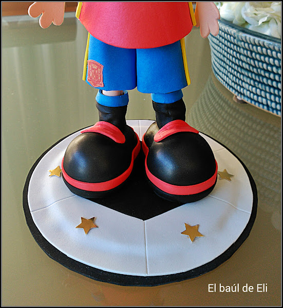En la siguiente fotografía podéis ver los pies del muñeco sobre la base. Lleva unas botas de fútbol en negro y rojo. Lleva calcetines en negro y azul. Y ya se puede ver un poquito de la equipación...pantalón azul con rayas amarillas en los laterales y como no, también lleva el escudo de la selección.