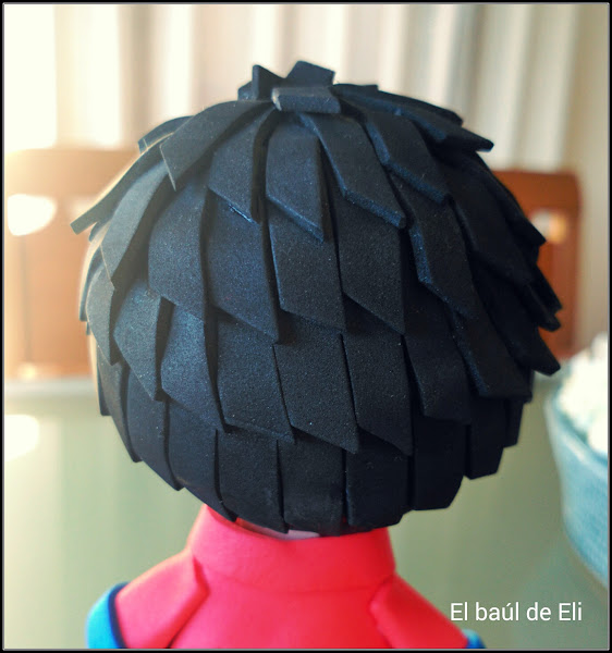 Antes de enseñaros el muñeco todo al completo, quiero que veáis su cabeza. Primero por detrás, podéis ver como queda el pelo, todo cortado en piezas pequeñas más o menos iguales y colocadas siguiendo un diseño y con mucha paciencia, jejeje