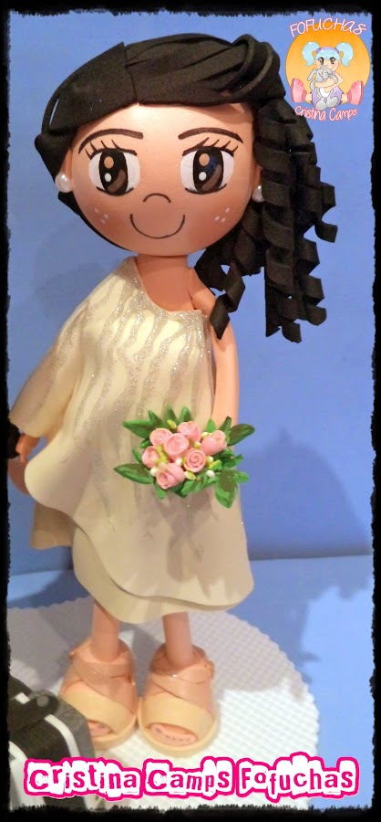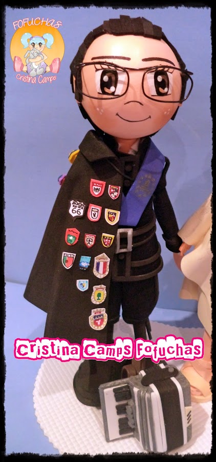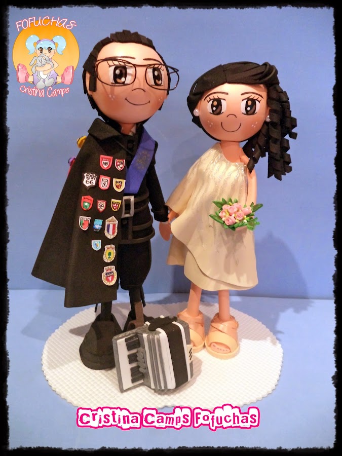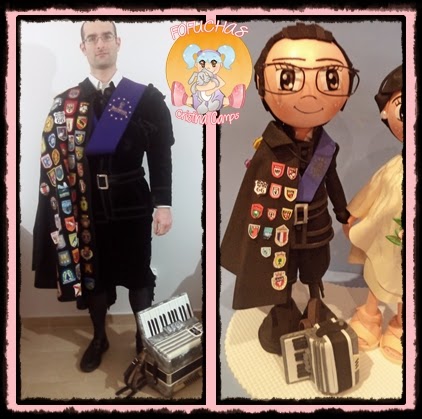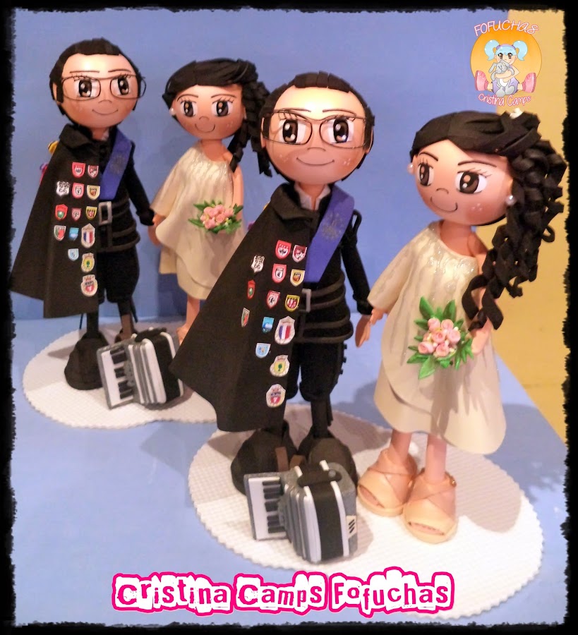 El iba vestido de tuno y ella guapísima, me encargaron dos parejas de fofuchos para los padres de los novios. Estas muñecas tienen un monton de detalles, a ver que os parecen.