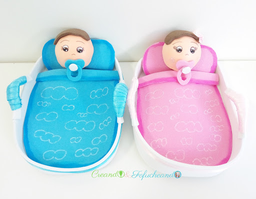 Ella hace un par de semanas nos enseñaba unos mellizos a crochet en sus capazos de lo más traviesos y molones, jajaja, y como las Musas son muy fan siempre de sus trabajos, he aquí mi versión con pequeños Fofuchitos en Goma eva.