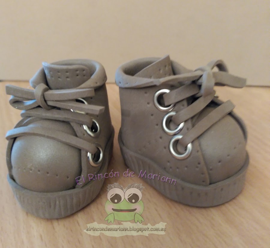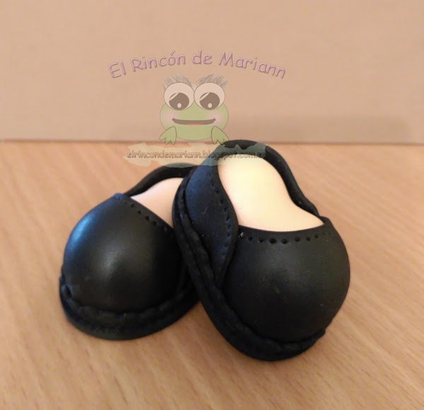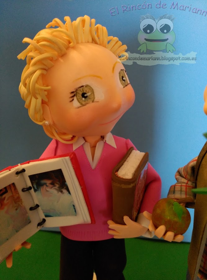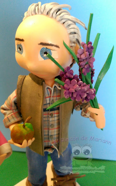 La camisa de él está pintada a mano, la manzana está hecha con pasta flexilble.