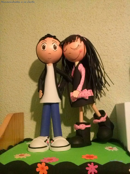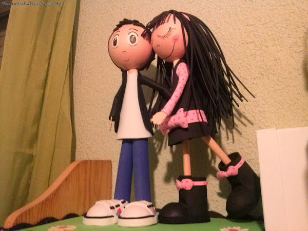 Hola a tod@s! De nuevo os traigo fofuchos, esta vez son unos felices novios con su parejita de niños que les llevan los anillos. Los hice para Neus y Carlos, por encargo de la hermana de la novia, Carmen. Gracias por confiar en mí!! Y me alegro mucho de que fuera todo bien!! Aquí van los nenes: Las gafas y los anillos están hechas con un alambre plano dorado. Los" papis" y novios: ...