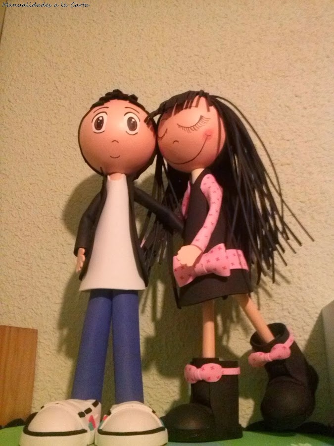Hoy os dejo una pareja de novios, guapísimos y muy simpáticos. Se casaron ayer y les deseo toda la felicidad del mundo. Ha sido un trabajo muy elaborado y como anécdota, no vieron sus muñecos juntos hasta el día de su boda porque no podían ver uno el traje del otro. No se si yo hubiera tenido la paciencia de esperarme. Muchos besos.