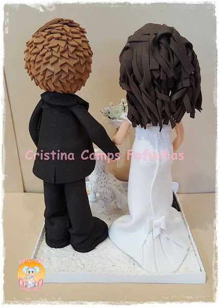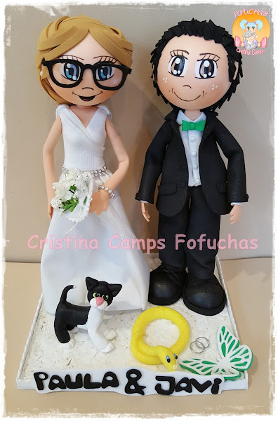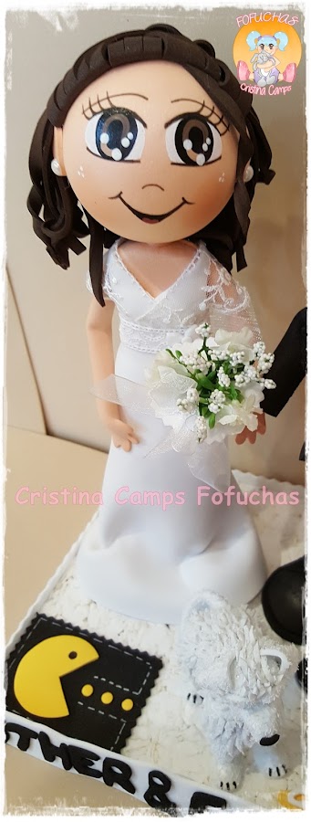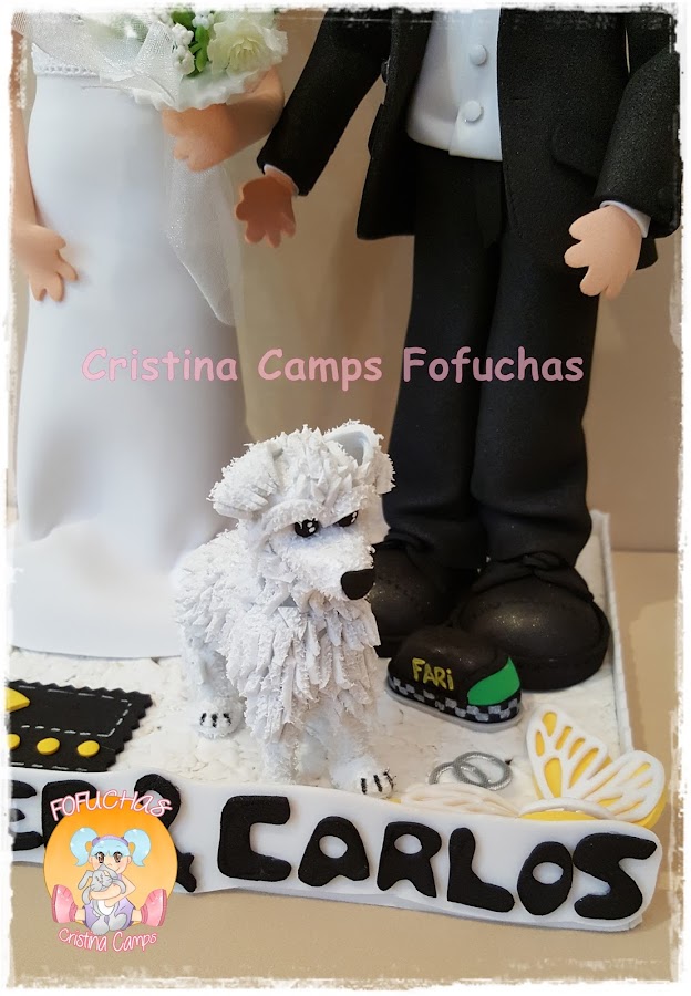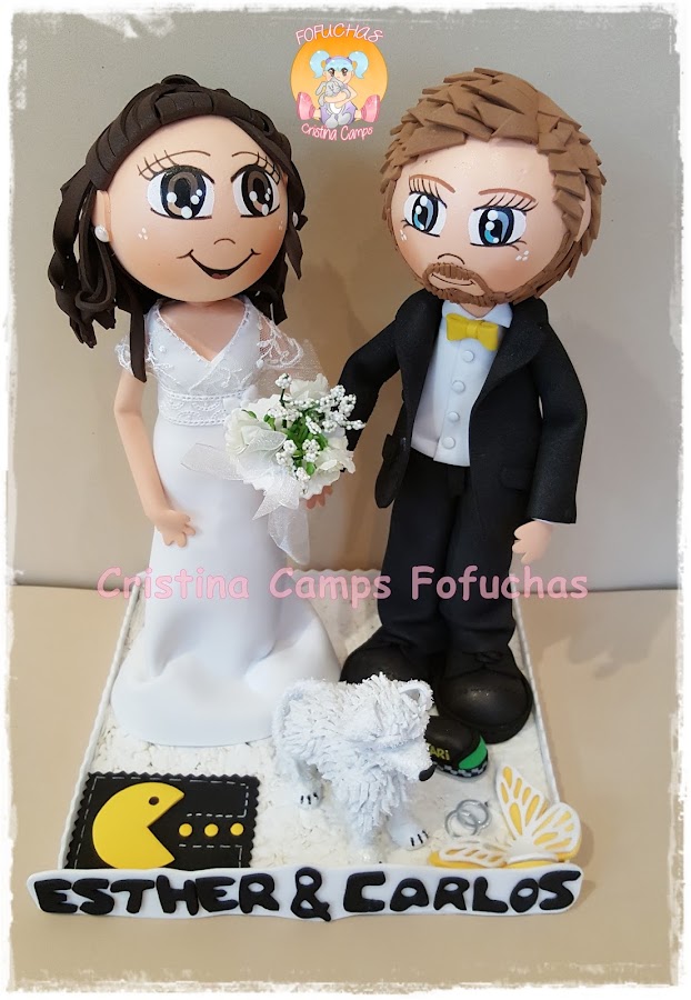 Otra parejita de novios.Estos van acompañados de su perrito y les hemos puesto en la base dos objetos relacionados con ellos, ala novia un comecocos y al novio la luz que llevan arriba los taxis.