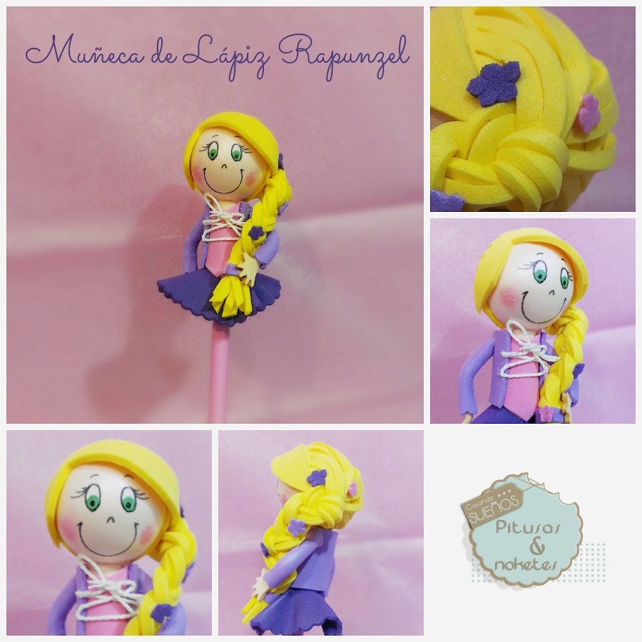 He de decir que el diseño no es íntegramente mío. Para inspirarme estuve consultando al gran Google, cogiendo algunas ideas, viendo otros proyectos similares.... Y al final mezclando un poco de todo y con otro poco que fue saliendo solo, pues aquí tenemos a nuestra muñeca de lápiz Rapunzel.