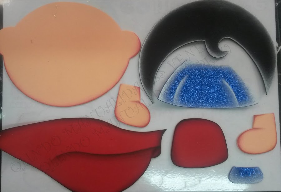 El procedimiento para Superman es el mismo, corta las diferentes piezas en el microporoso del color que indica el molde. Acá he utilizado foami escarchado para ciertas piezas como el cinturón y el cuerpo de Superman.