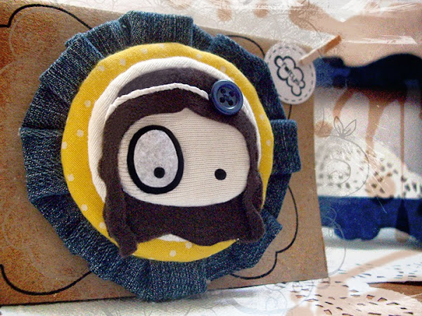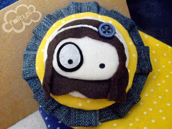 Esta pequeña castaña de melena ondulada sin flequillo está colocada sobre una base de algodón blanco, tela de lunares blancos sobre fondo amarillo y por supuesto el volante de tela vaquera. Todas las foltys de esta colección de broches originales llevan una diadema con botón de color azul que combina a la perfección con el vaquero.
