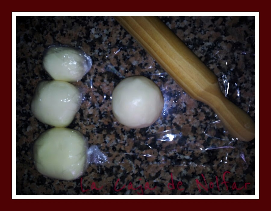 En el Blog de Dulce Imaginativa, le agrega Goma Traganto (1/2 cucharadita de café) para volver elástica la masa, yo no tenía y no agregué, creyendo que no me haría falta tampoco pues en varias web"s donde leí esta misma receta decían que no hacía falta, que salía un fondant super elástico, magnífico, etc. Sin embargo a mí, desgraciadamente, no me ha salido así. Por lo que después de salvar ligeramente el fondant con un poco agua (luego os explico), lo he envuelto en papel film y dentro de un tapper, a la espera de comprar la Goma de Traganto, para poder trabajar con el fondant, porque así es IMPOSIBLE, se cuartea completamente. Y sin embargo fijaos en las magníficas bolas que me han salido. En fin, sólo espero y deseo poder salvar el fondant, porque sería una penita tener que tirarlo, con lo bien que huele y sabe.