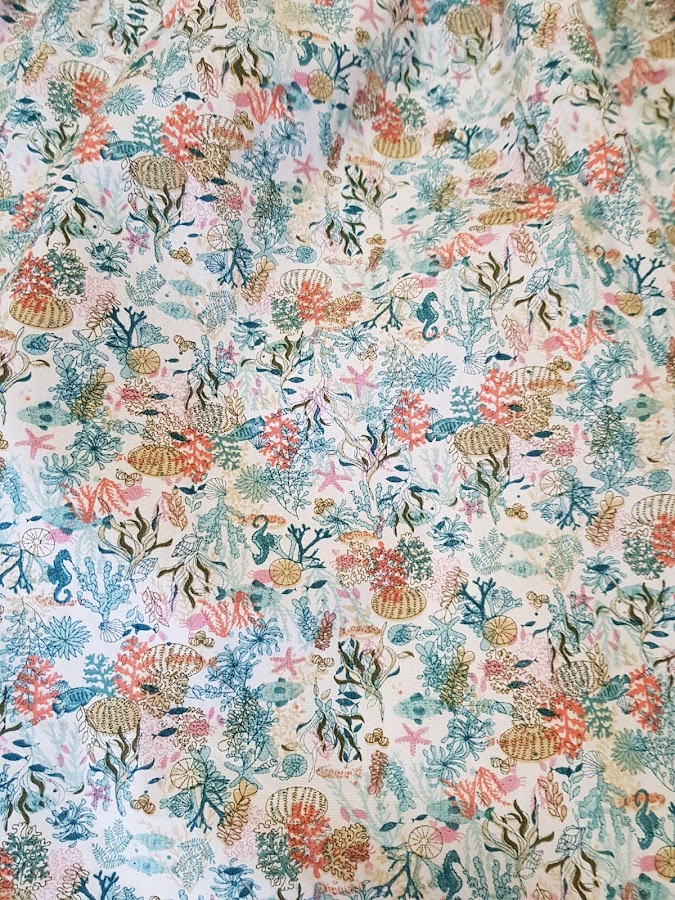 Aquí os muestro con detalle el estampado de la tela tiene dibujos de corales , algas , conchas, caballitos de mar.....de diferentes colores sobre un fondo de color blanco.
