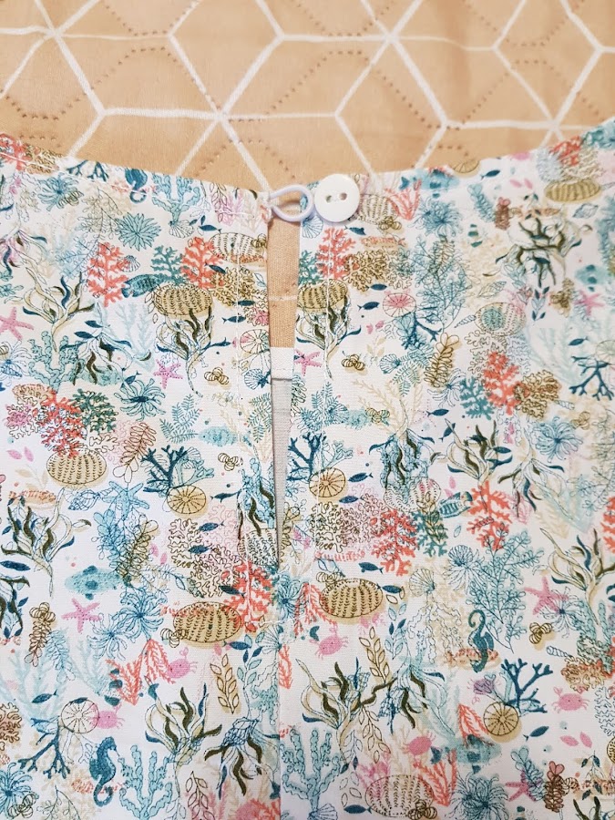 Para que el vestido sea más fácil de poner y quitar en vez de coser una cremallera le he hecho una abertura en la parte trasera con una presilla elástica y un botón y listo ¡¡¡ así nos ahorramos la cremallera.