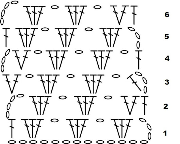 Para mi tejido he escogido el punto que te muestro a continuación, es muy sencillo de hacer, sólo emplea puntos altos y cadenas. Se inicia con una cadena base múltiplo de 4 + 1.