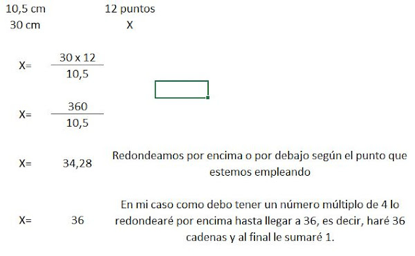 Empleamos la fórmula para hallar la cantidad de puntos que debemos tejer para alcanzar el ancho y nos queda así: Si en 10,5 cm tenemos 12 puntos, cuántos puntos necesitamos hacer para alcanzar 30 cm?