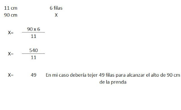Ahora emplearemos la fórmula para conocer cuántas filas debemos tejer para alcanzar el alto de la prenda y nos queda así: Si en 11 cm realicé 6 filas, cuántas filas debo hacer para lograr 90 cm?
