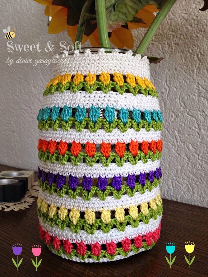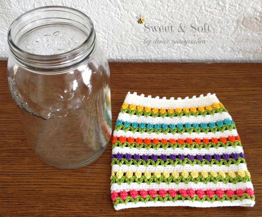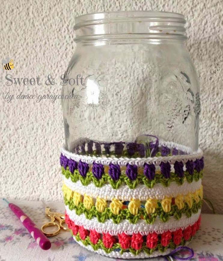 Y si como la mia, sus potes tienen la boca angosta pues en iremos dismuînuyendo poco a poco hasta tener la medida exacta. Pueden adornar el borde con algún ponto que les guste, yo lo hice con el punto Piccot.
