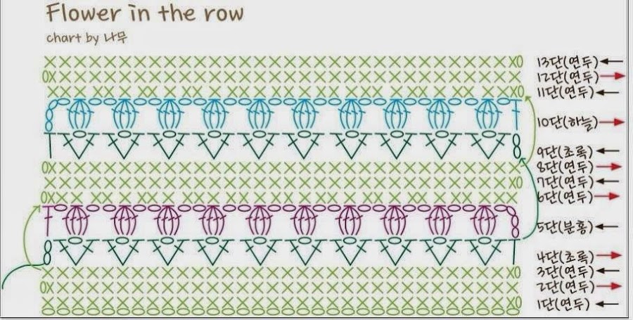 C.- En la quinta fila con un color diferente (rosa, fucsia, celeste, amarillo etc) con puntos rasos, intentamos colocarnos en el medio de una de las V formadas a modo de hojas y allí levantaremos 3 cad. y 2 pa. cerrados juntos, 2cad al aire, 3pa cerrados juntos hasta completar la fila.