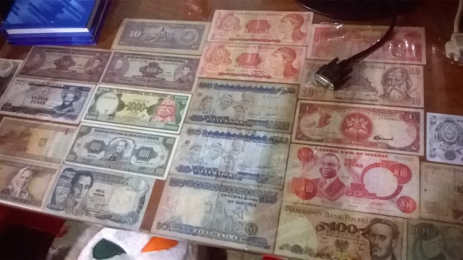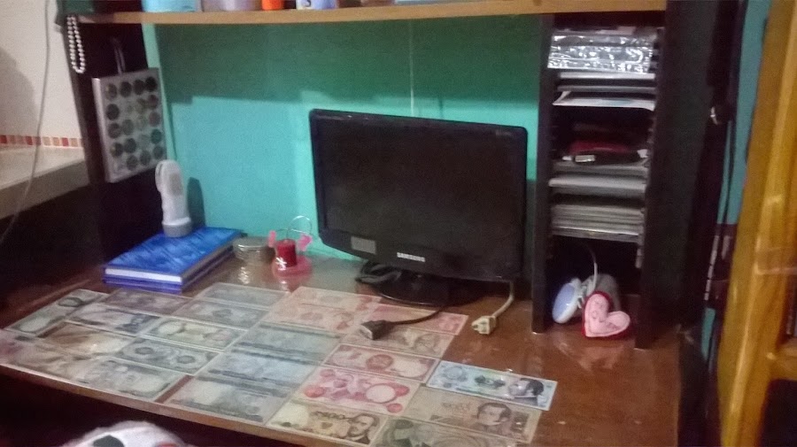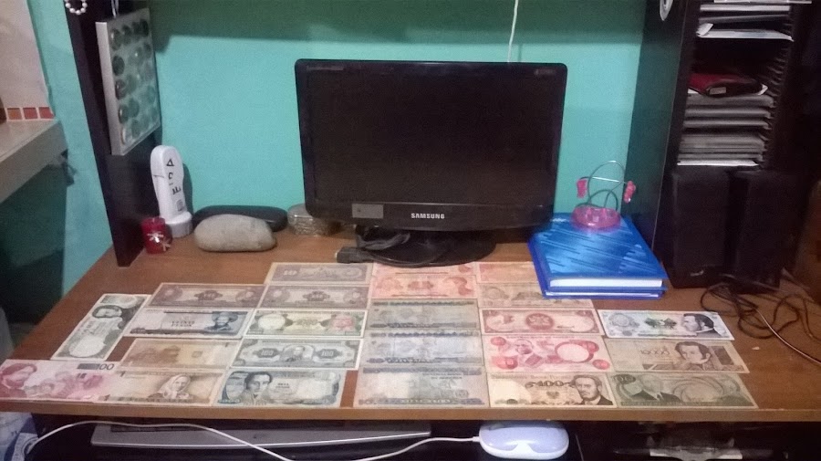 Así luce con su mantel de plástico de toda la vida muy económico por cierto, así cuando lleguen las visitas y vean el escritorio puedo presumir mi colección de billetes así como no queriendo la cosa, pensarán sin lugar a dudas que somos adinerados aunque nada más lejos de la realidad.