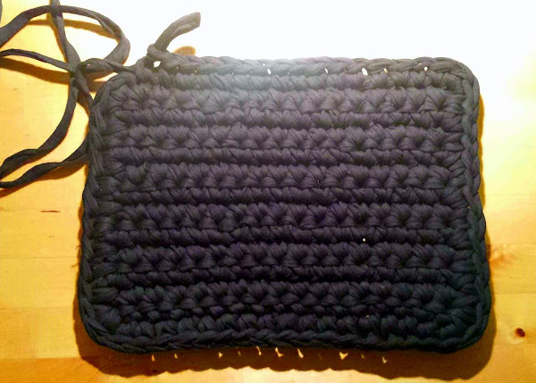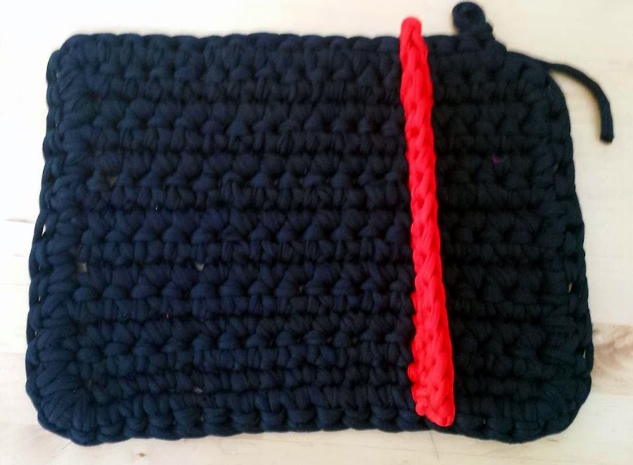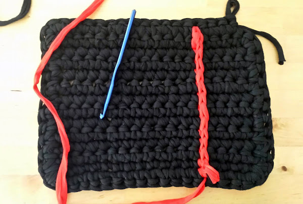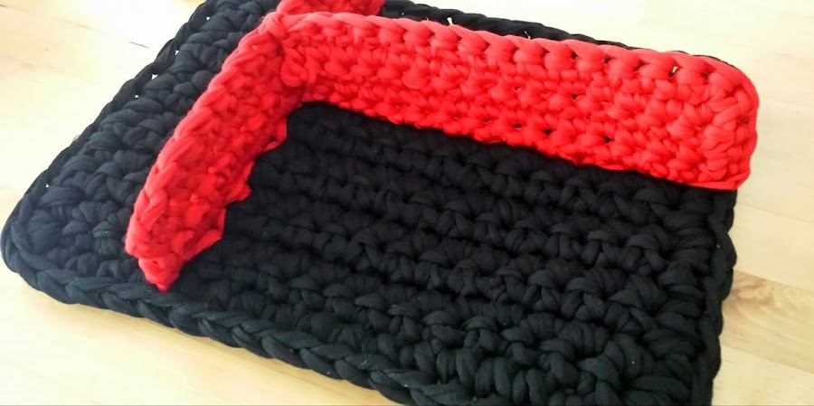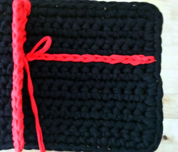 1. Hacer un rectángulo de puntos bajos del tamaño deseado. Yo al terminar las filas de puntos bajos, le he hecho otra fila alrededor de todo el rectángulo. El último punto lo he dejado sin tejer para después cambiar el color del trapillo.
