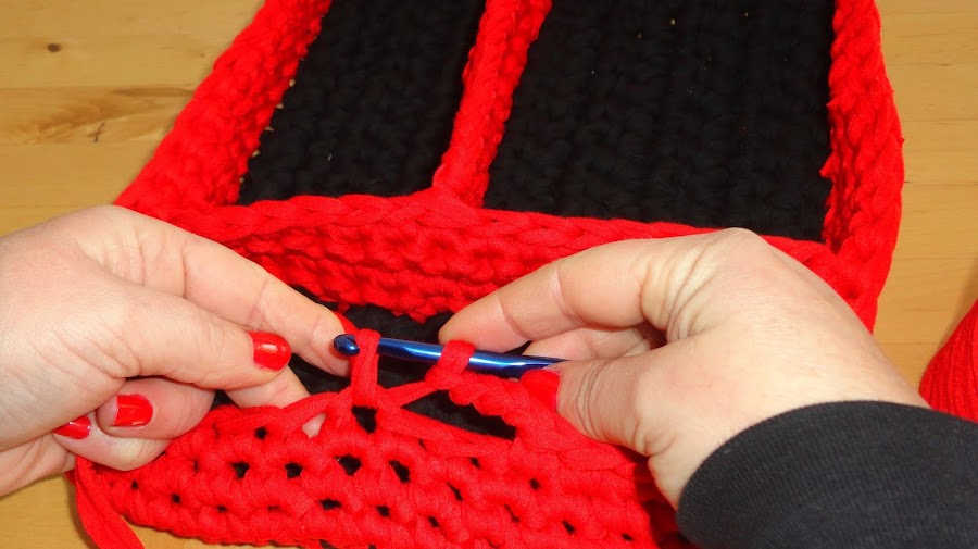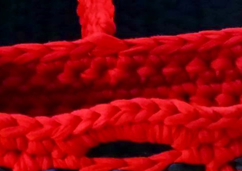 8. Hacer varias filas de punto bajo, cogiendo el punto entero, hasta tener el alto deseado teniendo en cuenta que vamos a tejer 2 filas más para hacer las asas.