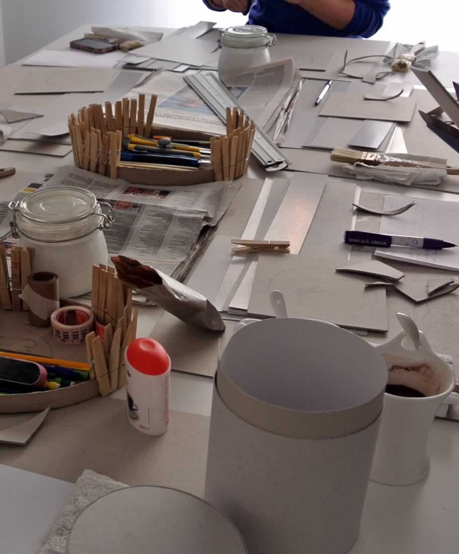 Con cartones, cartulinas, papel y cola empezamos a trabajar y a desordenar.