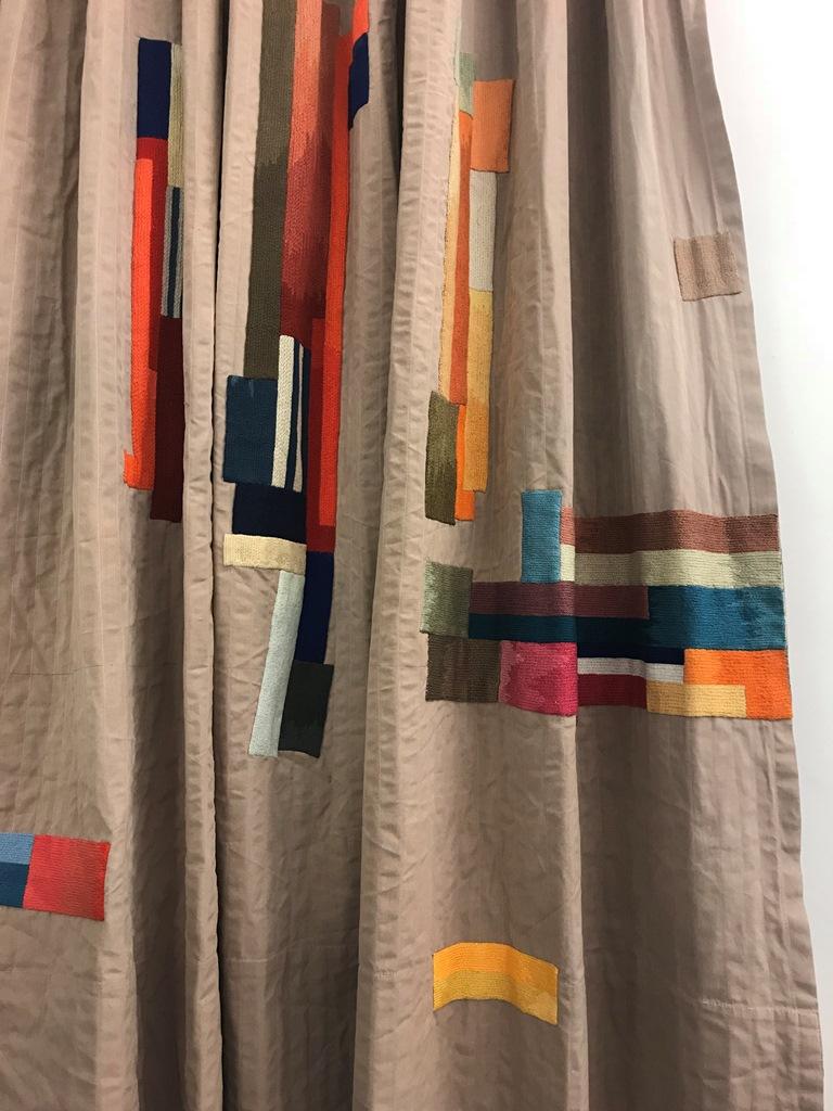Sobre una pared, en un costado del salón, se lucen unas cortinas de color marrón, llenas de nostalgia, que fueron intervenidas con bordados en punto cadena de hilo macramé; se acoplaron dibujos inspirados en el patchwork haciendo que las cortinas adquieran una nueva luz.