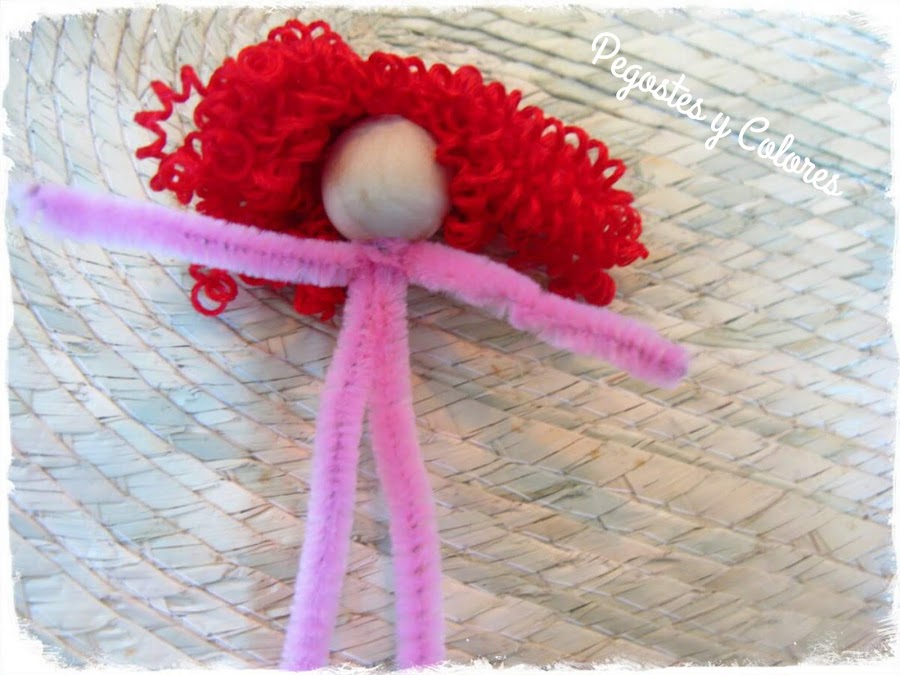 5.- Finalmente doble cada tira rizada en cuartos o en tercios y las acomode juntas, las inserte en el limpia pipas de las piernas por la cabeza. Para entender mas sobre esto, como dije puedes ver las instrucciones para el enredado de los Bendy Dolls en Santa Claus y Sra. Claus y Duendes Bendy Dolls.