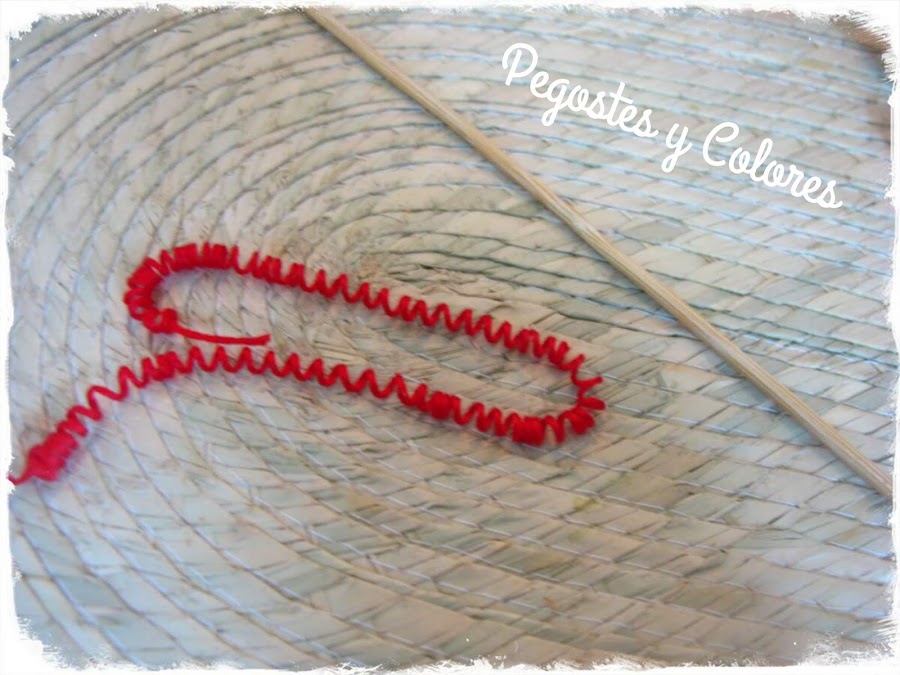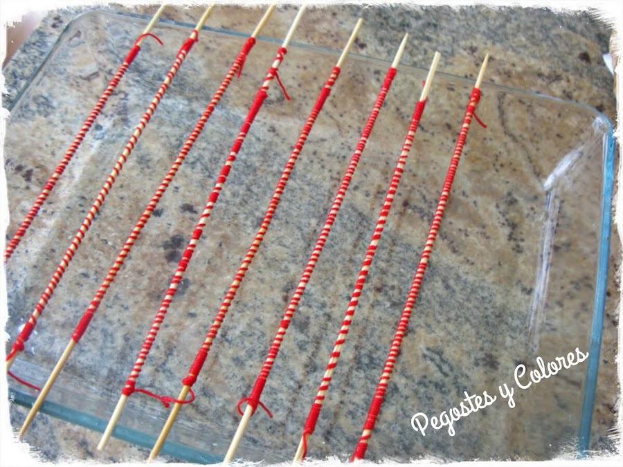 Use una hilaza completa de color rojo, la amarre de un extremo al palillo (amarrado sencillo sin nudo, dejando un espacio de 2 cm del palillo). Luego procedí a ir girando el palillo mientras se iba enredando la hilaza hacia abajo, no demasiado apretado. Cuando vi que me quedaba un espacio sin enredar del palillo de aprox, 2 cm, corte la hilaza y la amarre igual que al inicio.