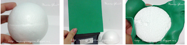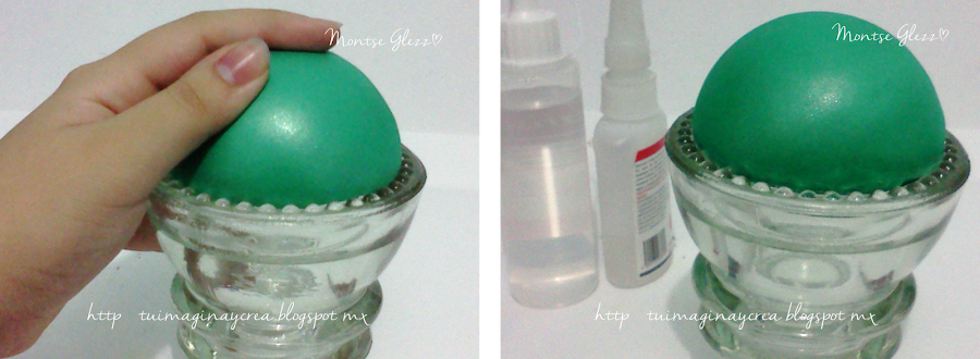 Y con el pegamento de tu preferencia ponemos solo un poco por todo el borde interior para que se pegue la media bolita ya forrada.