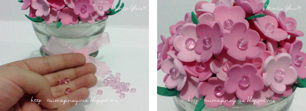 Las cuentas serán el centro de cada flor, las cuales pegue con pegamento instantáneo.