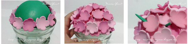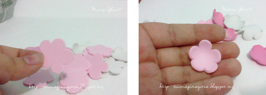 Transferi el molde a la goma eva, recorte y di un poco de calor con la plancha todo esta en ese tutorial ya que hice el mismo proceso para estas florecitas.